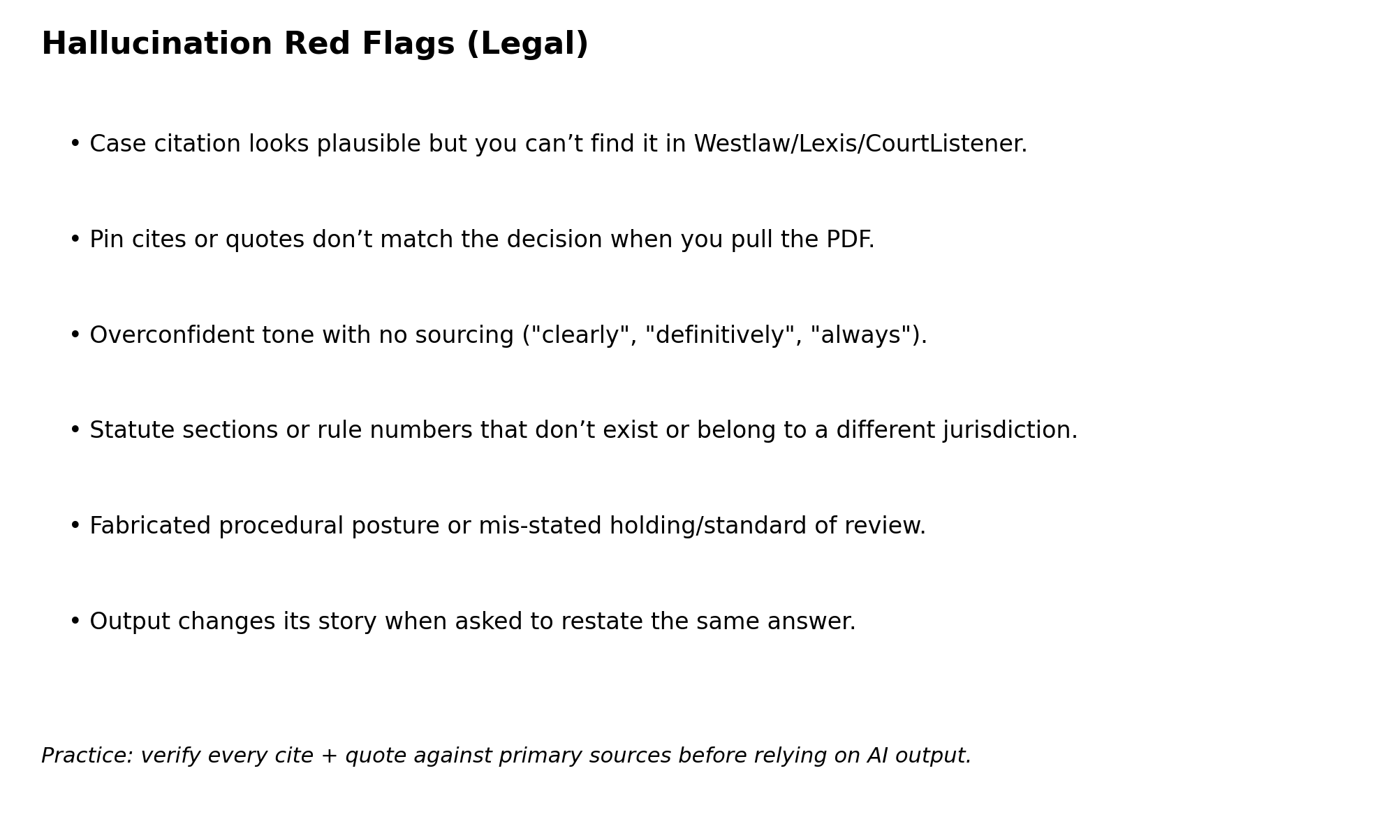 Common signs that a legal AI output may be fabricated or unreliable.