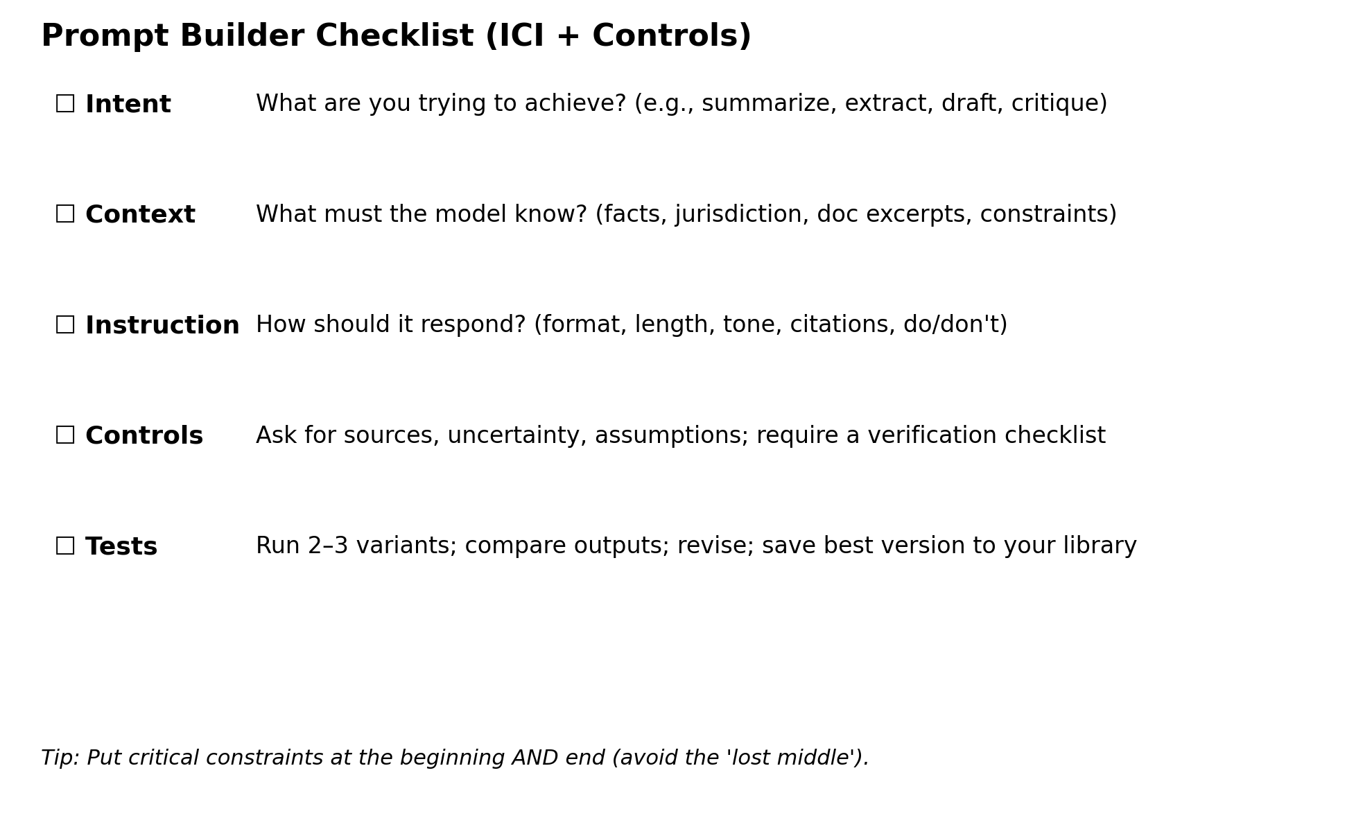 You are a [ROLE]. TASK (Intent): [What you want done] CONTEXT: [Jurisdiction, facts, pasted text] INSTRUCTIONS: - Output format: [bullets/table/memo] - Use only the provided sources; if you must infer, label it as an assumption. - Provide a verification checklist for any factual/citation claims.
